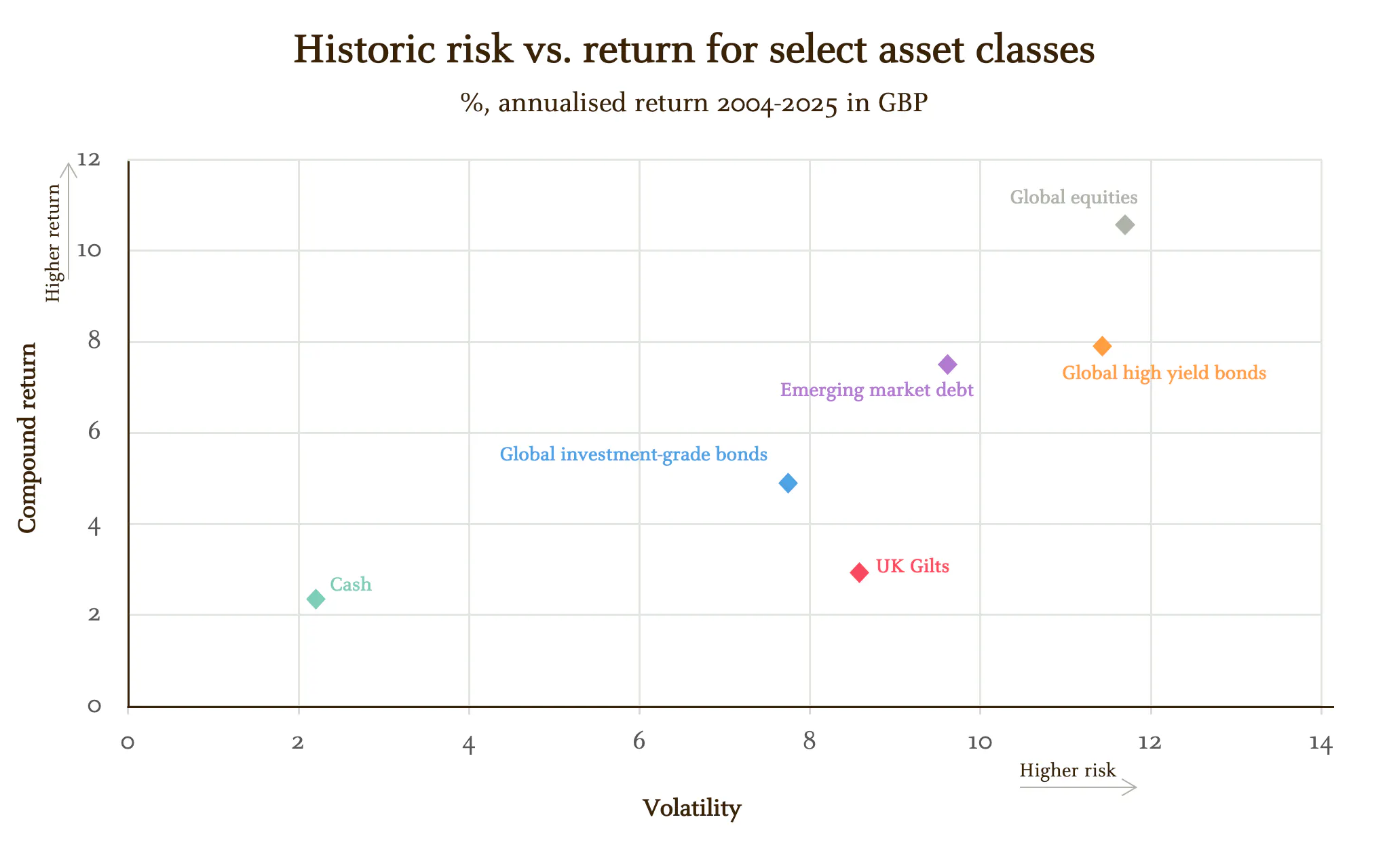 Source: Bloomberg, LSEG Datastream, MSCI, J.P. Morgan Asset Management. Volatility is the standard deviation of annual returns since 2004. Cash: J.P. Morgan Cash United Kingdom (3M); UK Gilts: Bloomberg Sterling Gilts; Global investment-grade bonds: Bloomberg Global Aggregate – Corporate; Emerging market debt: J.P. Morgan EMBI Global Diversified; Global high yield bonds: ICE BofA Global High Yield; Global equities: MSCI All-Country World Index (includes developed and emerging markets). Past performance is not a reliable indicator of current and future results. Guide to the Markets – UK. Data as of 31 December 2025.