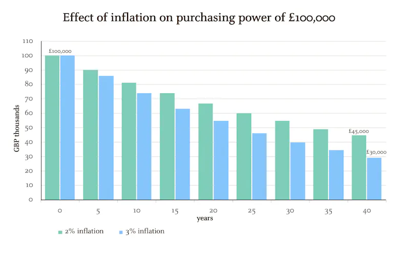 Beware of the impact of inflation, which reduces the value of your cash over time. If your money is not invested, its purchasing power – the amount of goods that your money can buy – can fall by more than half over a 40-year time horizon if inflation is 2% per year. It's worth bearing in mind that inflation can exceed 2% – the Bank of England's target rate, as set by the UK government – which can pose an even greater threat to cash.