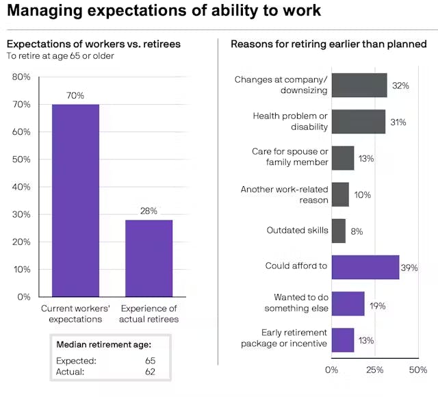 Workers' expectations of their ability to retire at 65 or older – versus reality – are significantly wide apart, according to J.P. Morgan Asset Management.