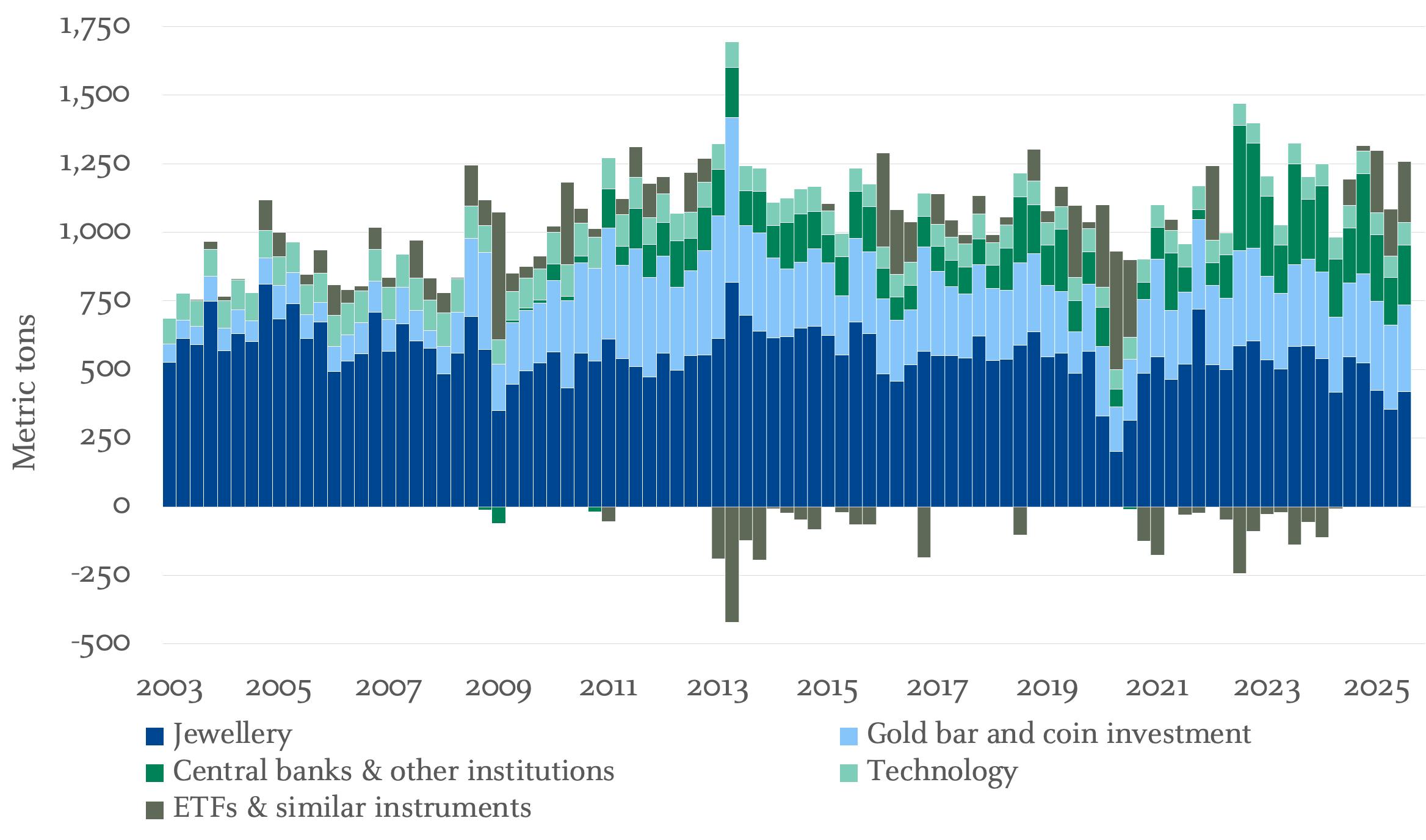 Source: Macrobond, J.P. Morgan Personal Investing. Data as at 30 September 2025. Statement reflects first three quarters of 2025. Each vertical bar reflects gold consumption over one quarter period, with the different colours splitting consumption by the type of buyer.
