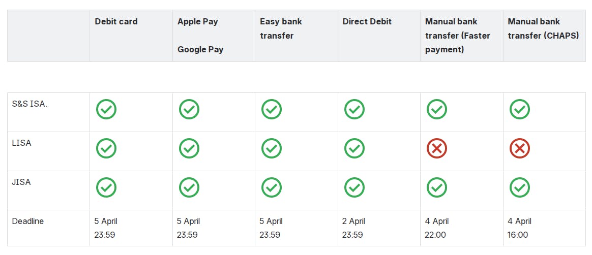 - The deadline for contributions by any of these methods is 23:59 on 5 April. An easy bank transfer (where money goes directly from your bank account to your chosen J.P. Morgan Personal Investing pot) is typically the fastest way to contribute to your ISAs.