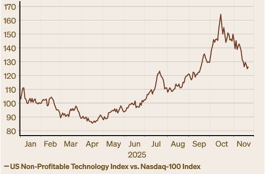 Source: Macrobond, J.P. Morgan Personal Investing, Bloomberg, November 2025. This chart shows the excess return of the Solactive US Non-Profitable technology Index vs. the Nasdaq 100 index. This chart refers to past performance, which is not a reliable indicator of future performance.
