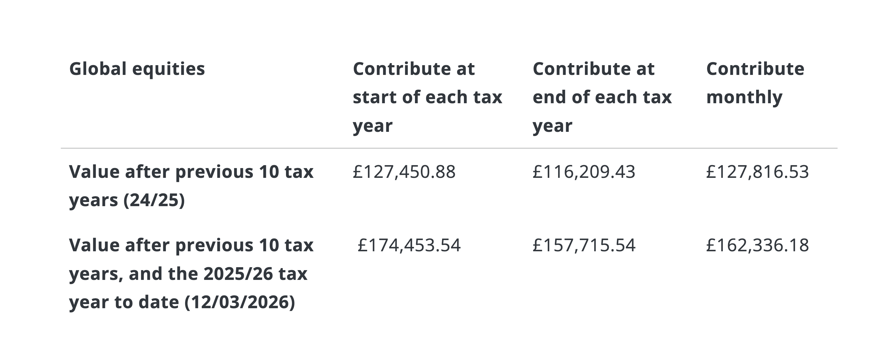 Investing the same annual amount as a lump sum at the start of each tax year would have resulted in £174,453. By contrast, the calculations suggest you’d have a sum of £157,715 if the lump sum was invested at the end of the tax year.