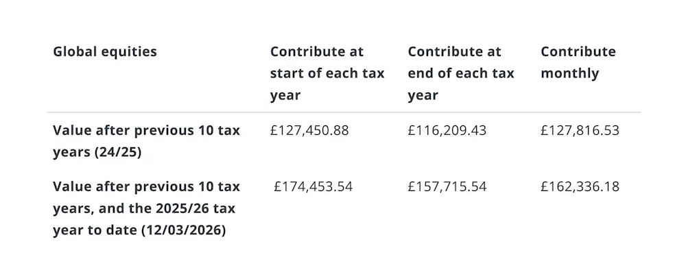 Source: J.P. Morgan Personal Investing, as of 12 March 2026. Global equities data is based on the MSCI All Country World Index. The average Stocks & Shares ISA contribution of £7,594 is for illustration only, drawn from the latest available HMRC analysis on ISAs (for the 2023/24 tax year, in the September 2025 report). These figures refer to past performance, which isn't a reliable indicator of future performance.