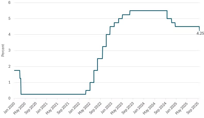 - The Federal Reserve has cut rates by 0.25% following its September policy meeting on 17 September. The new target range for the federal funds rate is 4.00%–4.25%.