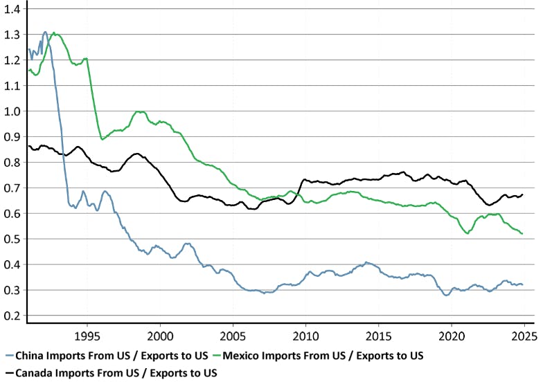 Chart 2: Ratio of US goods imported from, versus goods exported to, US (a figure below 1 shows a deficit)