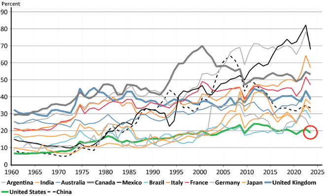 The Republican administration has identified a so-called “Dirty 15”, a list of countries with whom they say the US runs big trade deficits. Of Canada, China and Mexico in the chart below however, only China is really what we might call a ‘bad actor’ (acting badly in terms of trade). China’s imports from the US total only around 30% of its exports to the US. The ratio for Mexico has also deteriorated in the last decade, but it still does not match China. The chart shows that the US has been in a fairly stable trade deficit with these three nations in the last 20 years.