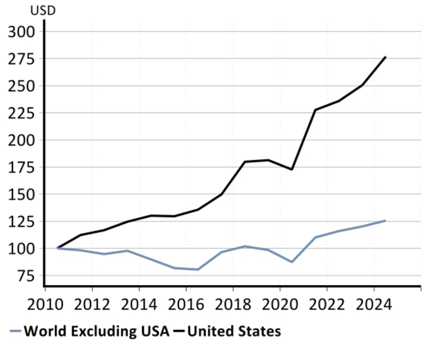 For example, US equities have a higher P/E ratio than most other developed markets (called "trading at a premium") versus other regions. However, they also benefit from very strong corporate earnings and robust US economic growth, especially post Covid. As a result, the US market has a high P/E versus other regions, but it is a premium valuation we believe US equities deserve. The chart below highlights as well how earnings growth differs between the US and the rest of the world. Earnings in the US have been growing much more strongly than elsewhere, and with the US economy on strong footing, we believe US earnings will remain supported.